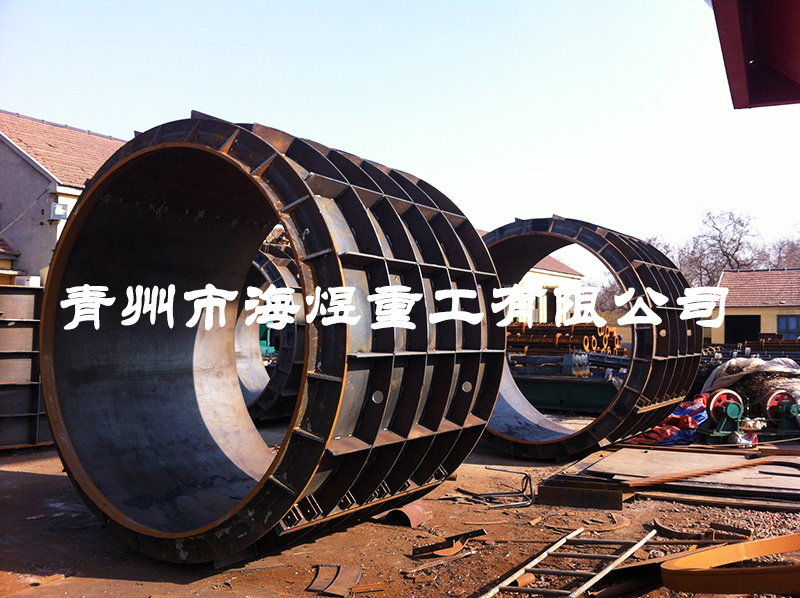 2400×2000水泥制管模具可用于生產柔性企口排水管,由于管徑較大,筒體厚度采用10mm,環(huán)筋、縱筋厚度分別為12,14mm;每套模具在出廠之前均用磨光機打磨內部,使其光滑、圓順,保證成型管子的外觀質量符合標準要求。