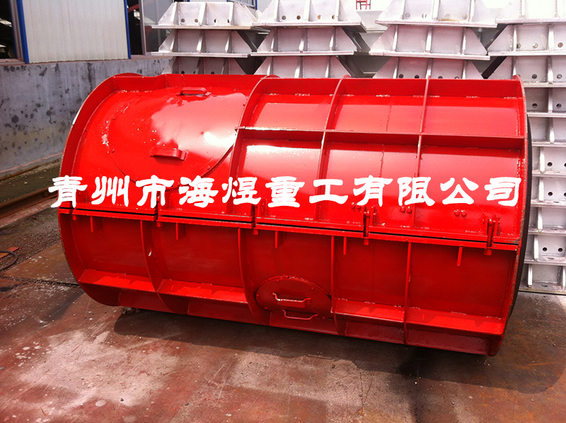 檢查井模具是在平口涵管模具的基礎(chǔ)上,根據(jù)裝配式鋼筋混凝土檢查井圖集要求,在平口模具筒體上預(yù)留大小不一的1-4個(gè)孔,并用螺拴固定孔蓋,拆裝方便;檢查井一般由收口、上井室、下井室和底板拼裝組成,用懸輥工藝成型井室,用振動(dòng)工藝生產(chǎn)收口部分。