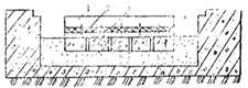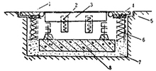 1. 振動臺框架;2. 隔振材料;3. 附加重量(活動基礎塊);4. 松散緩沖隔離層(砂+木屑);