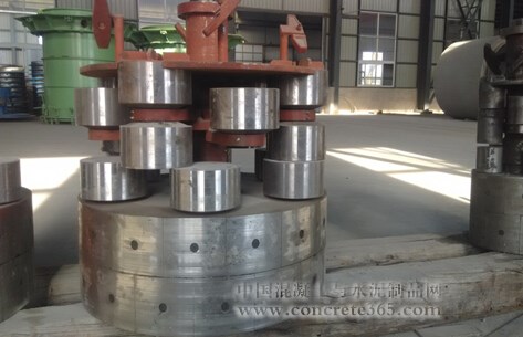 該工藝采用立式生產(chǎn)方法,模具垂直豎立于地面上的底托盤上,承口振動及工位旋轉(zhuǎn)裝置置于地坑內(nèi),擠壓及升降等主要裝置均在地面上。 徑向擠壓制管工藝采用半干硬性混凝土,布料機(jī)構(gòu)向管模內(nèi)喂料,通過擠壓成型頭(圖1)的高速旋轉(zhuǎn)擠壓管模間的混凝土,擠壓成型頭的直徑尺寸就是管道的內(nèi)徑尺寸,擠壓同時上部成型頭以一定速度上升,使之成型,下部休整頭以反方向擠壓、磨光。 徑向擠壓制管工藝生產(chǎn)承插口管時由于承口部分的斜度單擠壓難以使混凝土密實(shí),承口部分的成型須配以輔助振動,一般還需噴灑少量的水,以調(diào)整承口部分混凝土的塑性。 ![]() (圖1)