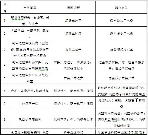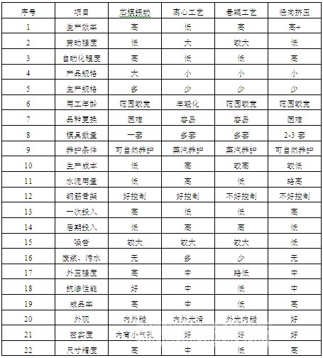 立式徑向擠壓制管作為新型的制管工藝最大的優(yōu)點(diǎn)在于采用干硬性混凝土,立式生產(chǎn)后可立即脫模。瞬時擠壓成型,每根管僅用2~3min,生產(chǎn)效率高。但同時它的抗?jié)B性較差的缺點(diǎn)也比較突出,需要在制管過程中嚴(yán)格控制各種參數(shù)加以修正。 下面通過幾種制管工藝的比較來說明各自的特點(diǎn): ![]()