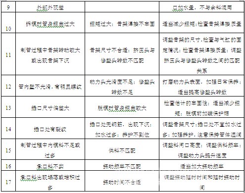 我公司在生產(chǎn)過程中總結(jié)出在操作過程中需要特別注意的項(xiàng)目有動力頭扭矩;修整頭扭矩;動力頭上升速度;承口喂料時間;底托延時振動時間;動力頭提升延時;底托振動延時;動力頭轉(zhuǎn)速;修整頭轉(zhuǎn)速;供料頻率;底托振動頻率;料閘口高度等。