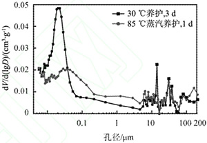 采用FEI Quanta FEG 250型掃描電子顯微鐿(SEM)觀察不同養(yǎng)護(hù)制度下水泥石的微觀結(jié)構(gòu),同時取對應(yīng)試樣,采用Pore Master 60GT型全自動壓汞儀進(jìn)行孔結(jié)構(gòu)分析,孔徑分析范圍為0.35nm~950um,將得到的數(shù)據(jù)作圖,分析無害孔、少害孔、有害孔及多害孔的生成情況,從孔徑分布和孔隙率的角度分析影響混凝土強(qiáng)度和耐久性的因素。